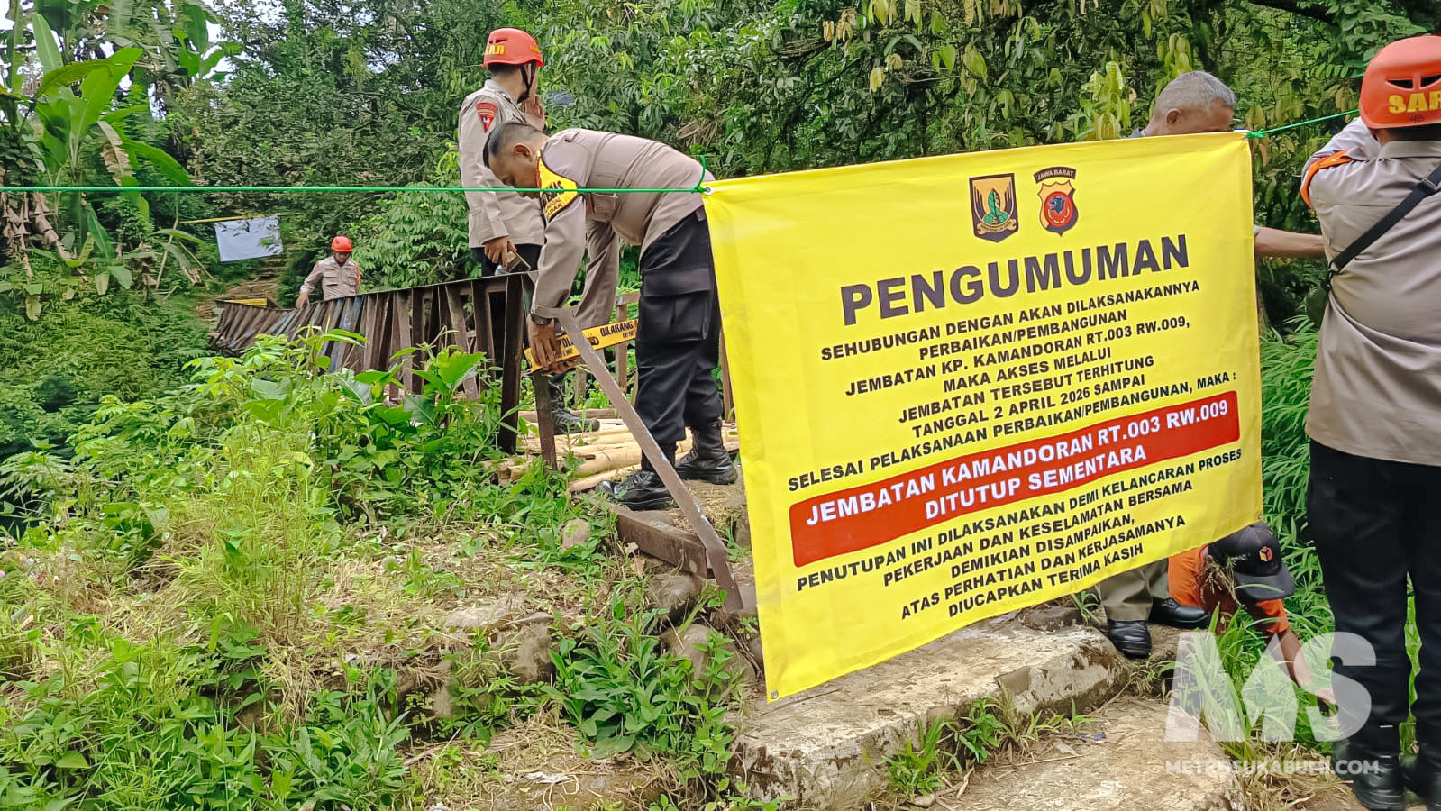 SUKABUMI – Jembatan di Kampung Kamandoran, Desa Karangtengah, Kecamatan Cibadak, yang sempat viral karena kondisinya melintir akhirnya disterilkan total. Aparat gabungan memasang garis polisi dan menutup akses bagi warga. Tak ada lagi yang boleh melintas.