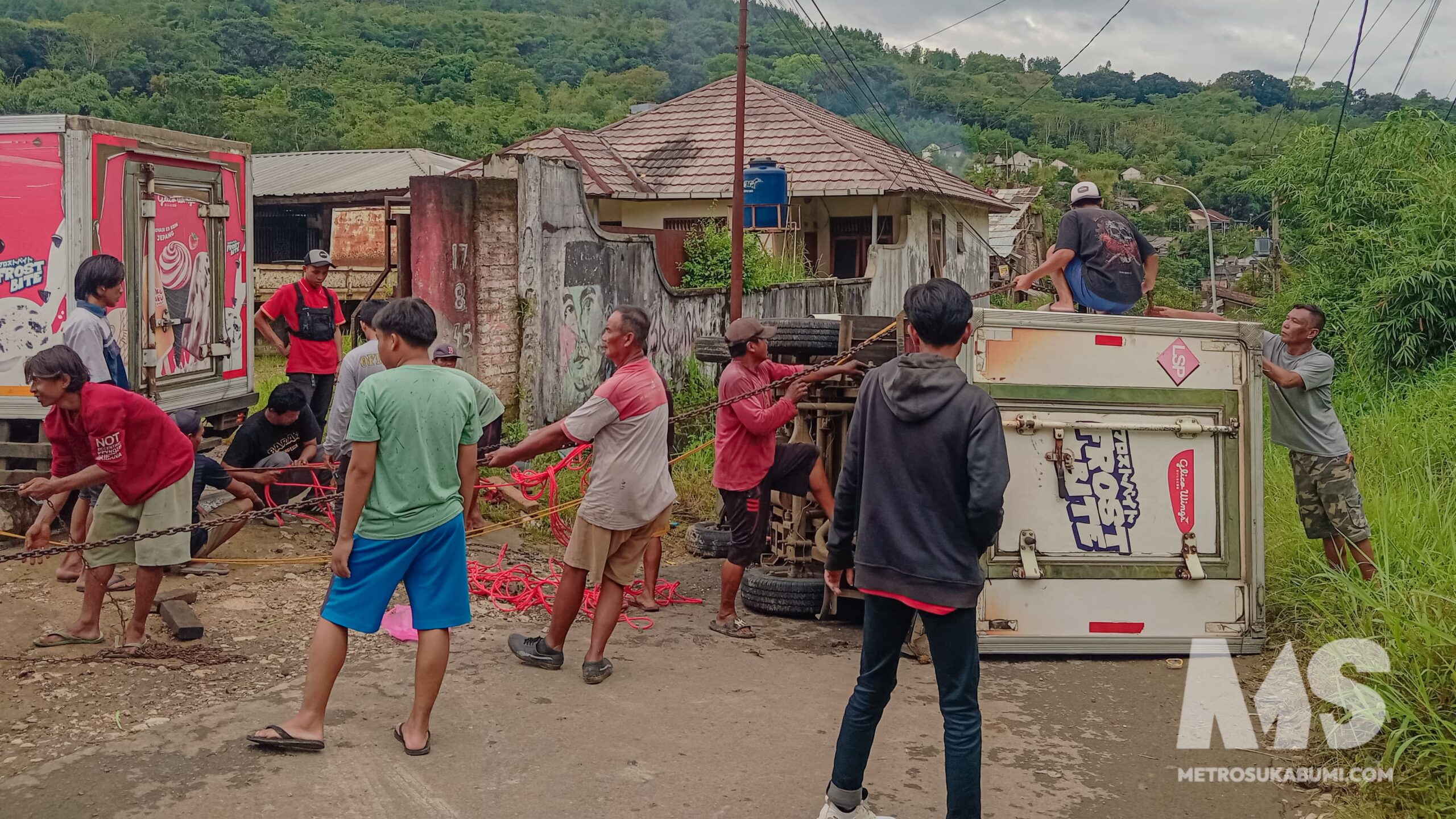 Mobil box es krim terguling di Jalan Tenjojaya Cibadak Sukabumi akibat hindari jalan berlubang