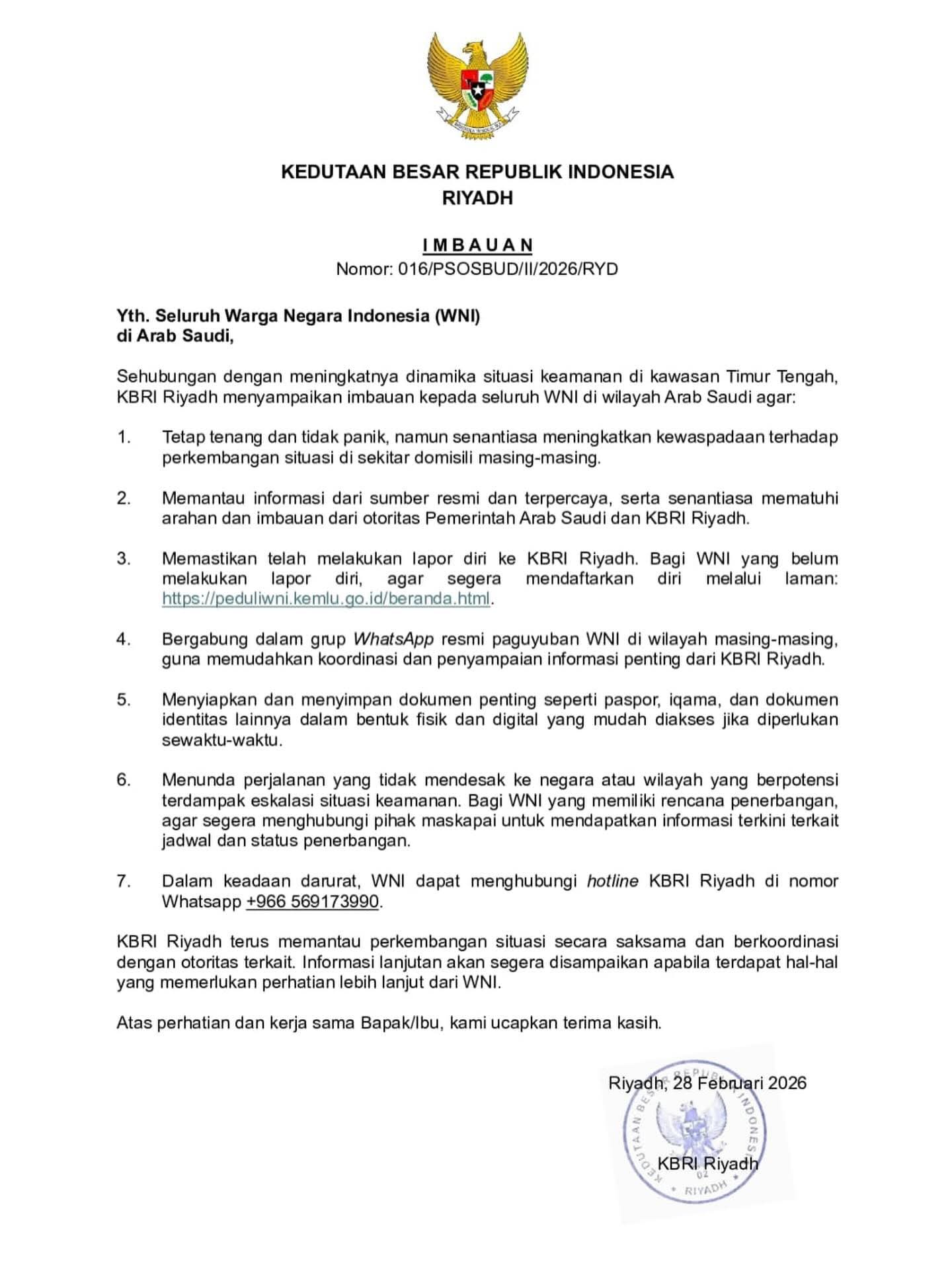 Dalam kondisi darurat, WNI dapat menghubungi hotline WhatsApp KBRI Riyadh di +966 569173990.